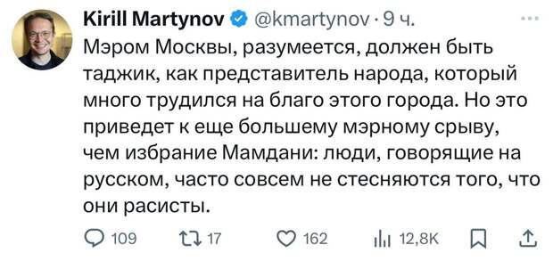 Следом за Соросом подтянулись и иноагенты. Отличился главный редактор "Новой газеты. Европа"* Кирилл Мартынов**. Он заявил, что, раз в Нью-Йорке победил мигрант-мусуьманин, значит, в Москве мэром надо сделать таджика.