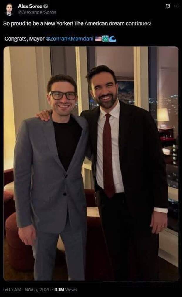 Александр Сорос, сын скандально известного финансиста цветных революций Джорджа Сороса, поздравил нового мэра Нью-Йорка Зохрана Мамдани с победой на выборах. Он написал в социальной сети Х/Twitter: