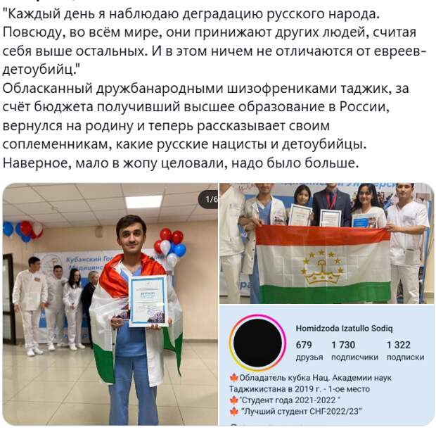 Вот вам пример такого результата. Изатулло Хамидов из Таджикистана получил высшее медицинское образование за счёт российского бюджета где-то на Кубани. Не раз участвовал в международных олимпиадах студентов-медиков, получал премии и награды, был обласкан нашими лоялистами-шизофрениками из сторонников односторонней «дружбынародов».