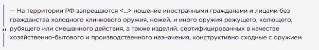 По данным МВД, число тяжких преступлений, совершённых с использованием иностранными гражданами ножей, неуклонно продолжает расти. Большинство ножей не попадают под установленную квалификацию «холодного оружия», но от этого режут и убивают ничуть не хуже.