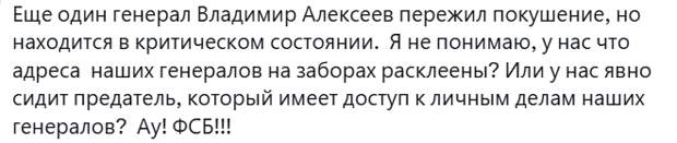 По его словам, генерал Алексеев жил достаточно скромно и демократично, в гражданской многоэтажке, на неохраняемой территории. «Но, может быть, в военное время стоит придумать что-то такое, чтобы отвечающие за разведку в этой войне люди могли работать без особенного риска нескольких выстрелов в спину в подъезде собственного дома?» – задает он риторический вопрос.