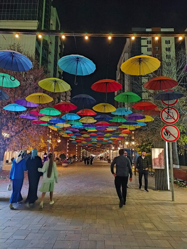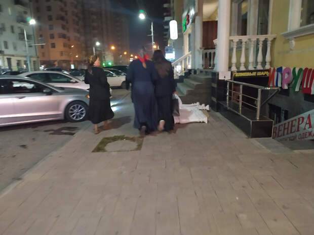 Женщины в Грозном могут гулять и в семь вечера. Но только компанией. Вот Грозный. Женщины немолодые, молодые в темное время появляются не только с родней, но и с детьми - без них никак. На первом фото совсем школьница. Видно, что семья "свободных взглядов": у старших женщин короткие юбки, девочка явно больше 12 лет и без платка. Может, это осетинки