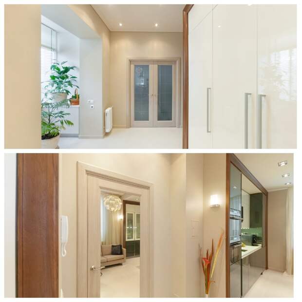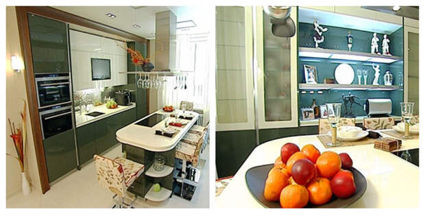 Акцентом в помещении стали витрины с коллекцией хозяйки. На полках расположились фигурки спортсменов, кубки, подарки, статуэтки и другие памятные вещи. В этих шкафах сделана подсветка. На кухне появились также шкафы со стеклянными дверцами и открытые полки с дополнительным освещением.