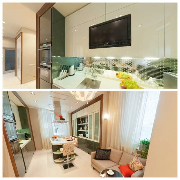 Напротив стола - телевизор. Он встроен в кухонные навесные шкафы. Фасады сделали глянцевыми, тёмно-зелёный цвет и цвет слоновой кости. Сочетание эффектное, однако каждому известно, что на такой поверхности каждая микрокапля и отпечаток пальца сильно бросаются в глаза.