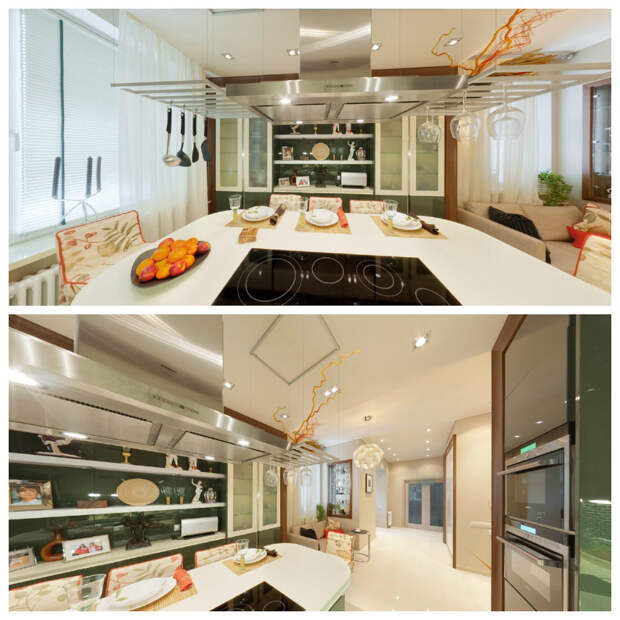 Телестроители во главе с дизайнером поставили задачу сделать более современное и функциональное пространство. В центре кухни расположили остров, который стал и рабочей поверхностью, и полноценным столом. Там же установлена варочная панель. Под столешницей - места для хранения.