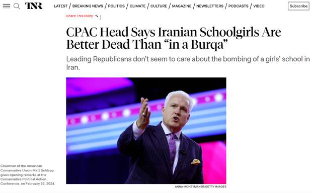 Консервативный идеолог движения MAGA Мэтт Шлапп попытался оправдать убийство более 100 девочек в начальной школе на юге Ирана, заявив, что они были спасены от религиозного экстремизма.