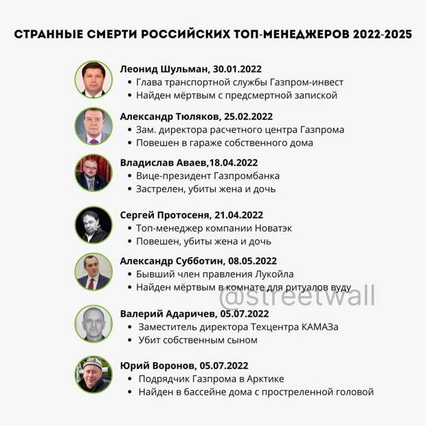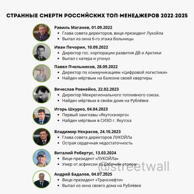 С 2022 года, как-минимум 17 топ-менеджеров России погибли при загадочных обстоятельствах (https://t.me/mgnzecon/2378