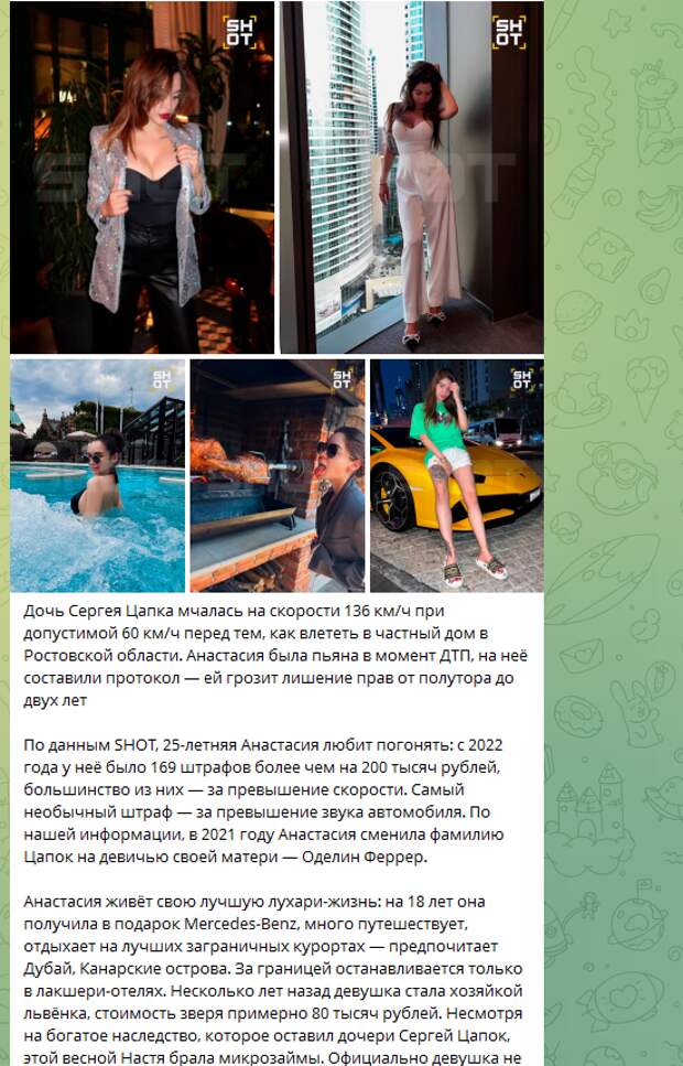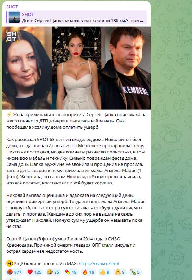 Наследница криминального авторитета Сергея Цапка Анастасия, похоже, рискует повторить судьбу своего отца. Девушка на бешеной скорости на своем Mersedes влетела в дом пенсионеров под Таганрогом. Вместе с ней в салоне находился сын местного прокурора. Как сообщили очевидцы, представители «золотой молодежи» вели себя странно, как будто были то ли под запрещенными препаратами, то ли в стельку пьяные. Во всяком случае, парень поцеловал девушку и сказал: «Малышка, ты классно ехала». Зато совсем не «классно» было хозяевам дома, поскольку автомобиль разнес две комнаты. По счастливой случайности владельцев не было на тот момент в помещении.