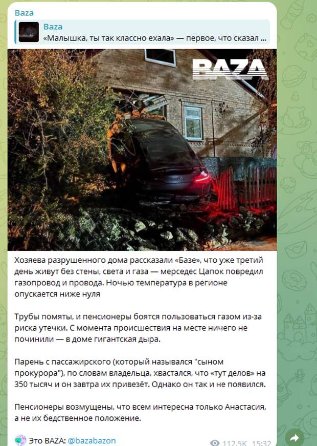 Телеграм-канал Baza выяснил у пенсионеров, как обстоят дела. Сейчас они живут с порушенной стеной, без света и газа, так как машина помяла трубу газопровода и оборвала провода. Ни о каком ремонте пока никто ничего не говорил.