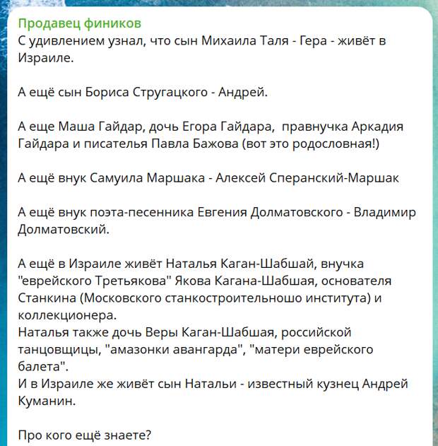 С удивлением узнал, что сын Михаила Таля - Гера - живёт в Израиле.А ещё сын Бориса Стругацкого - Андрей.А еще Маша Гайдар, дочь Егора Гайдара, правнучка Аркадия Гайдара и писателя Павла Бажова (вот это родословная!).А ещё внук Самуила Маршака - Алексей Сперанский-Маршак.А ещё внук поэта-песенника Евгения Долматовского- Владимир Долматовский.А ещё в Израиле живёт Наталья Каган-Шабшай, внучка "еврейского Третьякова" Якова Кагана-Шабшая, основателя Станкина (Московского станкостроительного института) и коллекционера...