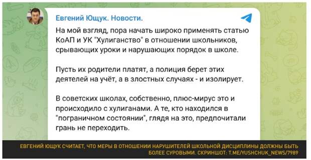 Ранее специалист по конкурентной разведке и аналитик информационных источников Евгений Ющук предложил в своём телеграм-канале начать применять в отношении школьников статью "Хулиганство" за срыв уроков и нарушение порядка в школе.