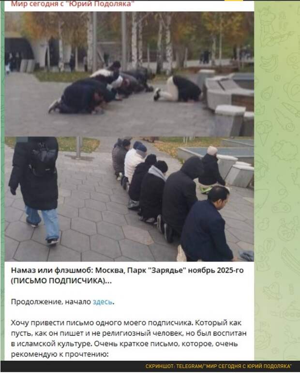 На видео, снятом очевидцем, видно, как толпа приезжих в самом людном месте парка показательно упала на колени и стала совершать намаз, что является грубым нарушением закона, ведь, согласно законодательству России, публичные богослужения должны быть согласованы с органами власти. В ином же случае это уже является политической, противоправной акцией.На провокационную ситуацию обратил внимание военный эксперт Юрий Подоляка, отметив, что тот, кто знает парк "Зарядье", понимает, что эти люди разместились в самом проходом его месте.
